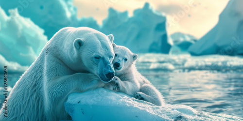 © VALUEINVESTOR, Naklejka premium a polar bear with its baby cub hugging an iceberg, generative AI