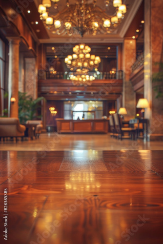 © grey, Obraz premium A polished wooden table in the foreground with a blurred background of a luxury hotel lobby. The background includes plush seating, elegant decors, a large chandelier, and a reception desk.