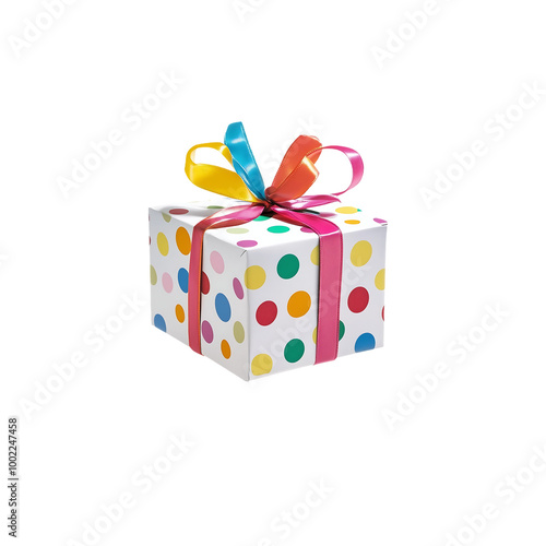 Obraz premium a polka dot gift box with a colorful ribbon isolated on white