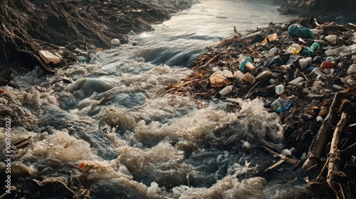 © ROY, Fototapeta premium A polluted river with plastic and debris flowing through it.