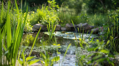 Fototapeta premium A pond in a natural reserve with native plants and wildlife, including frogs...