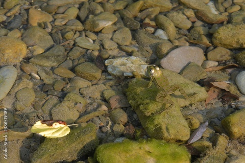 Obraz premium A pond with marsh frogs close-up, green algae and fallen leaves in clear water