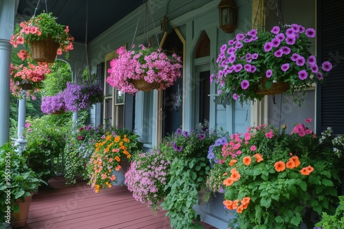 Fototapeta premium A porch with many hanging flower baskets of different colors