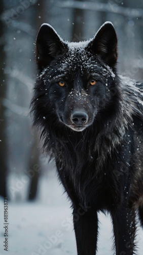 Naklejka premium A portrait of a black lone wolf in the winter snow staring directly at the camera