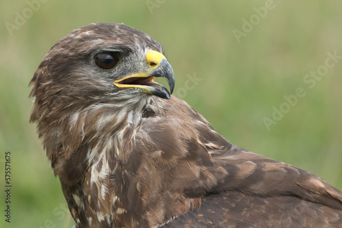 © RMMPPhotography, Obraz premium A portrait of a Common Buzzard against a green background