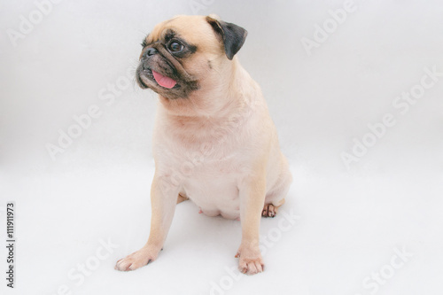 © fongleon356, Obraz premium A portrait of a cute pug dog sitting on the floor with tongue sticking out on white grey background