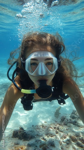 Naklejka premium A portrait of a girl underwater and air bubbles, capturing the beauty and...