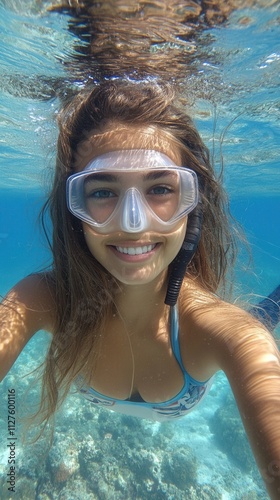 Fototapeta premium A portrait of a girl underwater and air bubbles, capturing the beauty and...