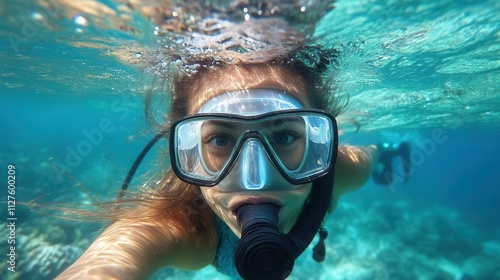 Fototapeta premium A portrait of a girl underwater and air bubbles, capturing the beauty and...