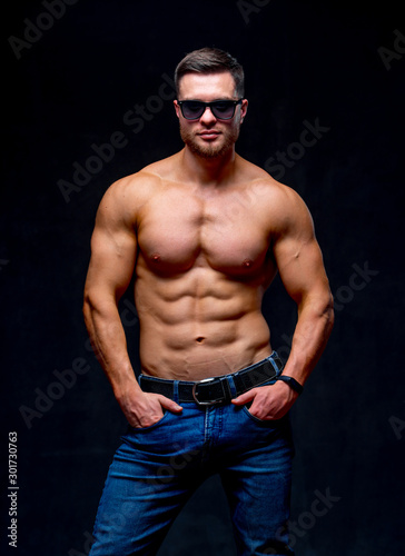 © Vadim, Fototapeta premium A portrait of a hot handsome strong guy man without a shirt against dark background. hands in pockets wearing glasses. Studio photo. Male beauty concept. Closeup.