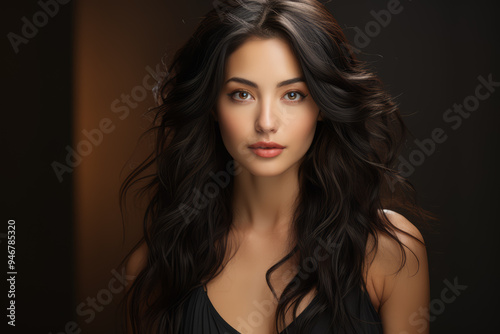 © Sebastian, Fototapeta premium A portrait of a person with lustrous black hair cascading over their shoulders, radiating confidence. Concept of self-assurance and allure. Generative Ai.