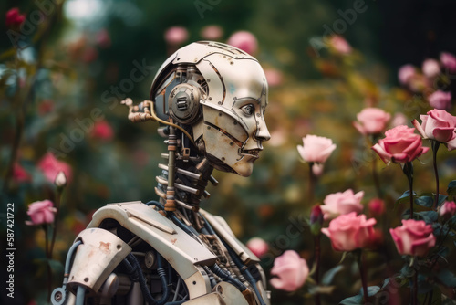 © rosinka79, Fototapeta premium A portrait of a robot standing in a rose garden. Created with Generative AI.
