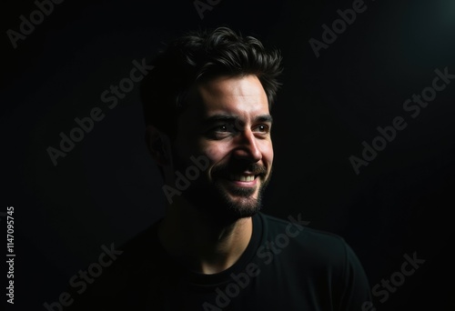 © Vibudhaart, Fototapeta premium A portrait of a smiling man, dimly lit against a dark background.