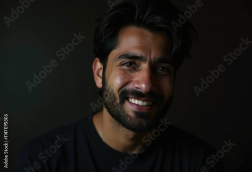 © Vibudhaart, Fototapeta premium A portrait of a smiling man with dark hair and a beard against a dark background.
