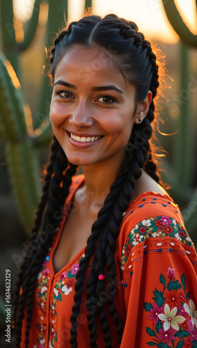 © Grow with Dani, Fototapeta premium A portrait of a smiling young woman outdoors, with long braided hair, wearing an orange dress. The scene captures her beauty and happiness against a soft background.