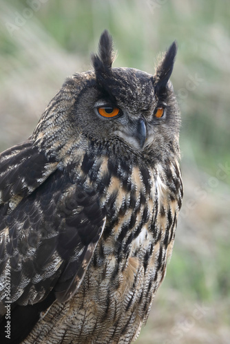 Fototapeta premium A portrait of an adult Eurasian Eagle Owl resting in a meadow