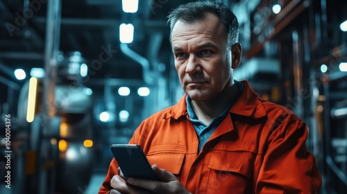 © Johannes, Fototapeta premium A portrait of an industrial man engineer with smartphone in a factory, working.