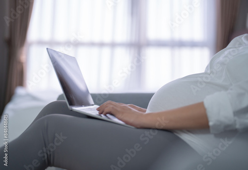 Fototapeta premium A portrait of happy Asian pregnant woman using, working online with computer laptop notebook tablet device with screen in bedroom at home. Having a baby. Family people lifestyle. Mom love.