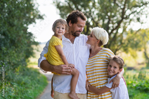 © Halfpoint, Fototapeta premium A portrait of young family with small children in sunny summer nature.
