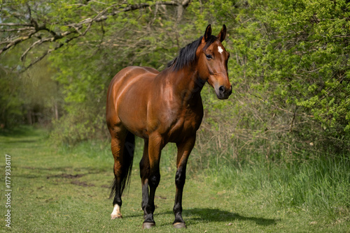© Bakul, Fototapeta premium A Portrait Photograph of a Bay Horse Standing in a Sunny Green Meadow with Trees in the Background