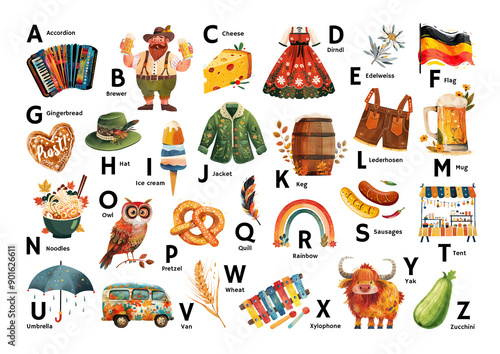 © Gubina, Naklejka premium A poster for a restaurant, cafe, snack bar, menu featuring the alphabet and illustrations of Oktoberfest, designed to teach little ones the alphabet. Watercolor illustration in pastel colors.