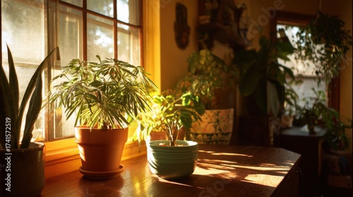 Fototapeta premium A potted plant sits on a windowsill, with a bowl of soil next to it. The sunlight is shining on the plant, making it look healthy and vibrant. Concept of warmth and comfort, as the plant