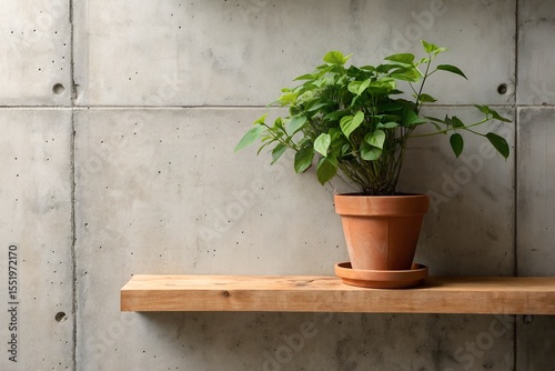 © AYESHA, Naklejka premium A potted plant sits serenely on a light wooden shelf against a backdrop of a textured concrete wall.