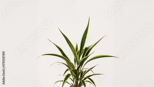 Fototapeta premium A potted plant with long, pointed green and yellow leaves against a plain...