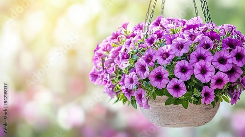 © Olga, Fototapeta premium A potted plant with purple flowers dangles from hooks, set against a green and pink backdrop