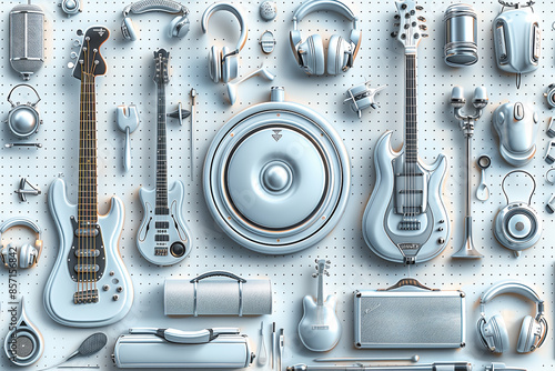 © Sergei, Fototapeta premium A power tool with an abstract design, on the background of which the energy of rock music is transmitted. Macro photography of an abstract music poster