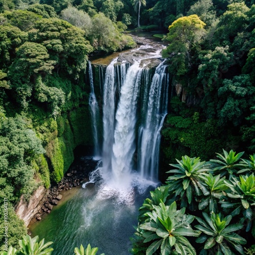 © Sunbeam, Naklejka premium A powerful aerial shot of a waterfall cascading through dense, lush jungle vegetation. The bright green leaves contrast with the white spray of the water, creating a dynamic and untouched natural scen