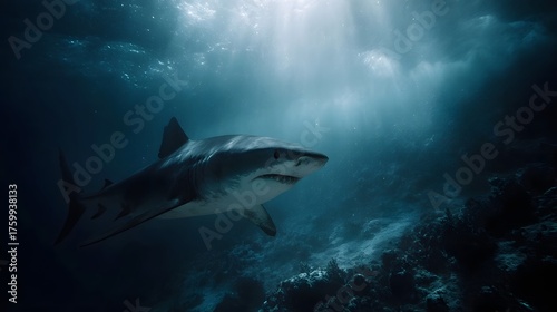 Fototapeta premium A powerful and majestic shark gracefully swims through the sunlit underwater ocean depths with light rays filtering from the surface