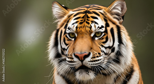 Naklejka premium A powerful and majestic tiger's face in a detailed close-up, showing its...