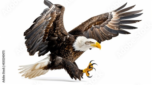Naklejka premium A powerful bald eagle with wings spread wide, talons extended as if about to land, isolated on solid white background,