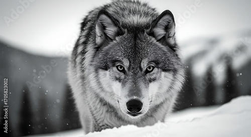 Naklejka premium A powerful black and white portrait of a beautiful wolf looking with intense eyes, a majestic and wild animal in its natural forest habitat.