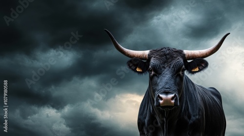 © Mohammed, Naklejka premium A powerful black bull stares intently into the camera against a backdrop of stormy clouds. Its horns are long and sharp, and its eyes are piercing.