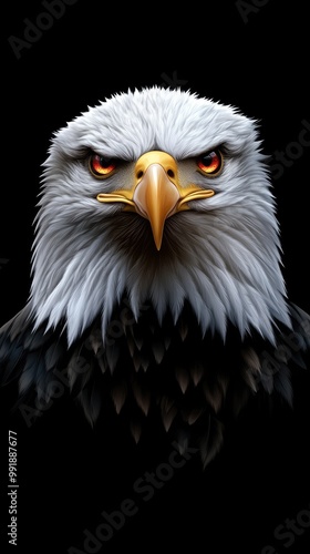 © ZinaZaval, Fototapeta premium A powerful black eagle head with piercing red eyes, artistically rendered in a symmetrical design with strong contrasts on a black background