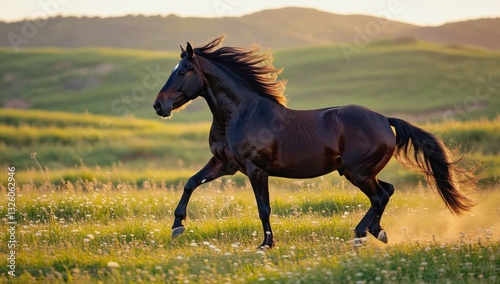 Fototapeta premium A powerful black horse runs freely in a lush green meadow under the warm glow of a setting sun. The scenery features rolling hills and wildflowers, creating a serene atmosphere