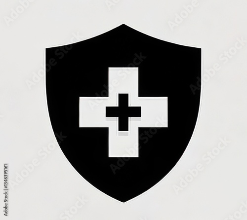 © farjana, Fototapeta premium A powerful black shield emblazoned with a stark white cross, symbolizing unwavering protection and medical security against a simple, bright background.