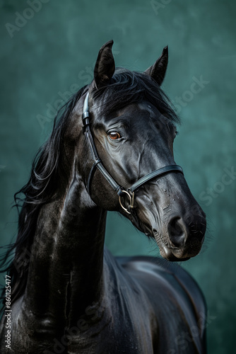 Fototapeta premium A powerful black stallion, symbolizing equestrian beauty, stands in a...