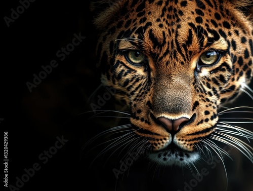 © iNCuteCraffic, Obraz premium A powerful close-up of a leopard's face, emphasizing its striking fur pattern and intense gaze against a dark background.
