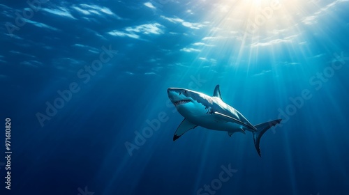 Fototapeta premium A powerful Great White Shark swims gracefully through the crystal-clear blue ocean water, illuminated by a bright sun shining through the surface, a captivating display of predator and prey, and the b