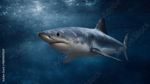 Fototapeta premium A powerful great white shark swims gracefully through the deep blue ocean currents illuminated by subtle light rays from above