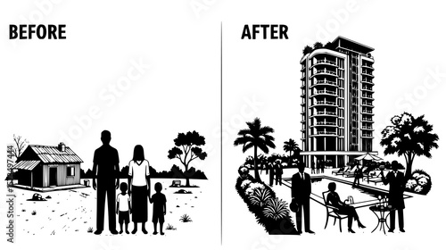 © ChristianRiyanfhi, Naklejka premium A powerful illustration showing transformation from rural home to modern building, growth and evolution.