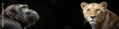 Fototapeta premium A powerful image of a gorilla and a lioness, capturing their intense gazes and majestic presence.