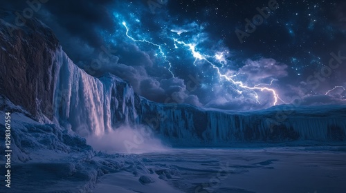 © Ceyhun, Fototapeta premium A powerful lightning storm over a frozen waterfall in a remote arctic landscape
