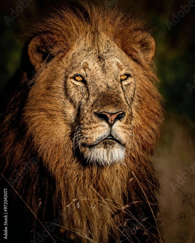 Obraz premium A powerful lion blends into its grassy habitat, eyes focused