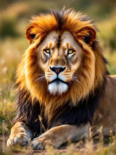 © Andriana, Obraz premium A powerful male lion with a thick mane lying on the ground, displaying its regal presence and observing its territory in the golden light of the African savanna
