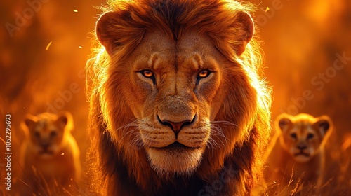 © ALIF JATI KUSUMA, Fototapeta premium A powerful male lion with two cubs in the background, backlit by a golden sunset.