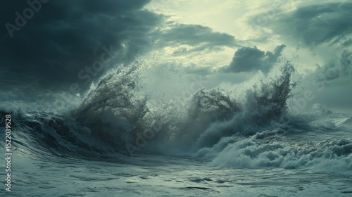 © lestari, Fototapeta premium A powerful ocean wave crashes under a dramatic stormy sky